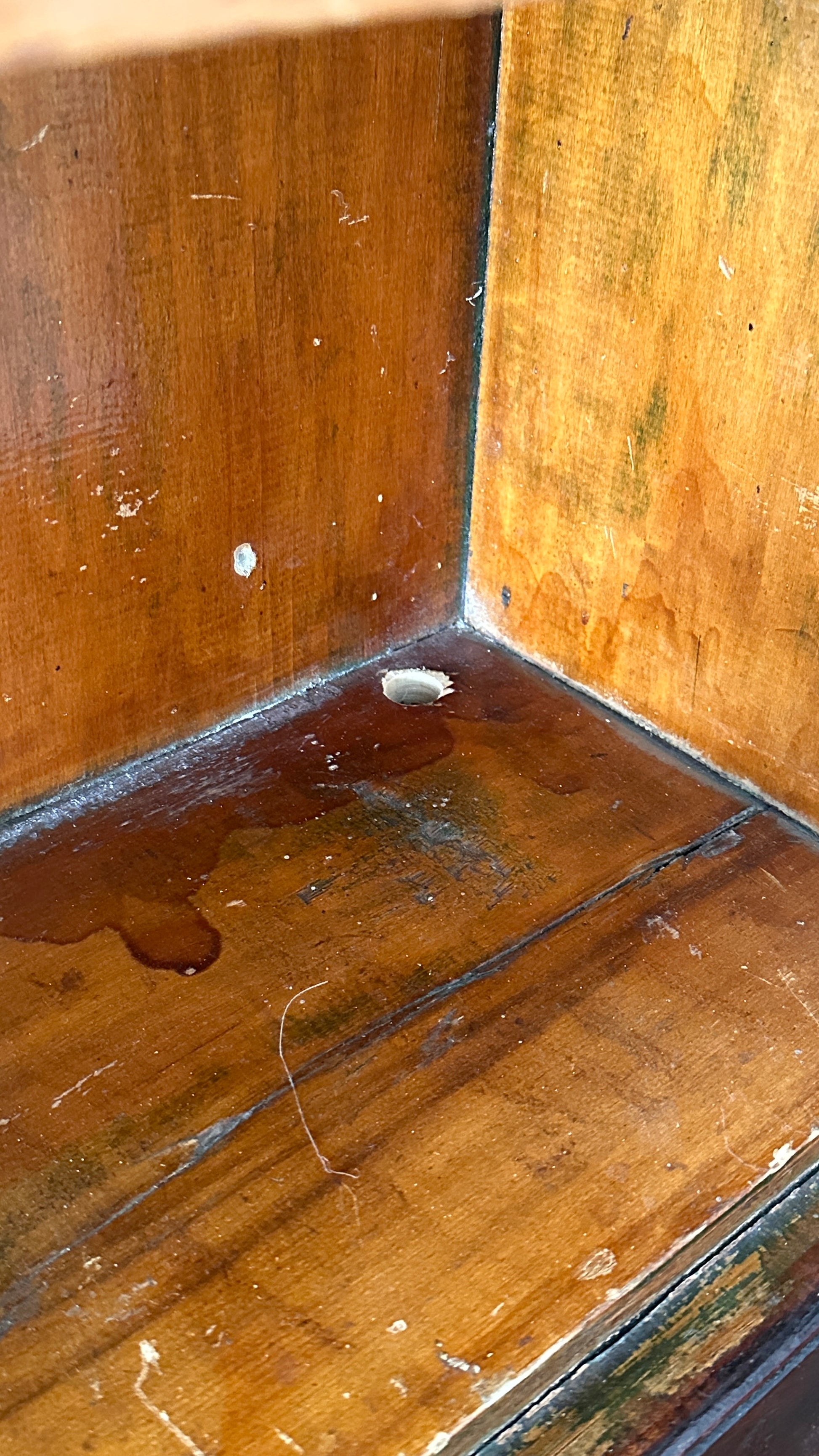 **Large hole on left side, one on inside of the cabinet, and smaller holes on top shelf section. Overall wear consistent with age and use. Comes apart in 2 pieces.